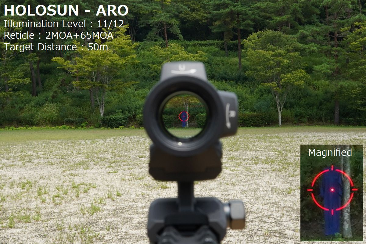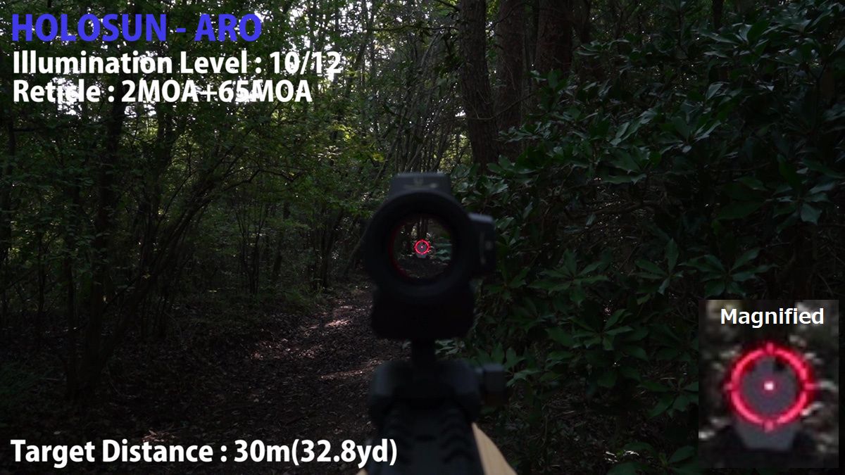 ●透明度や光学性能が増しているので、マグニファイヤー(拡大鏡)を介して覗いた場合もLPVO感覚で射撃を行うことができ相性は良い。より中距離戦闘にも重きを置きたい場合はBDC機能(距離による弾道落下予測)があるARO-EVOも良い選択肢となる。