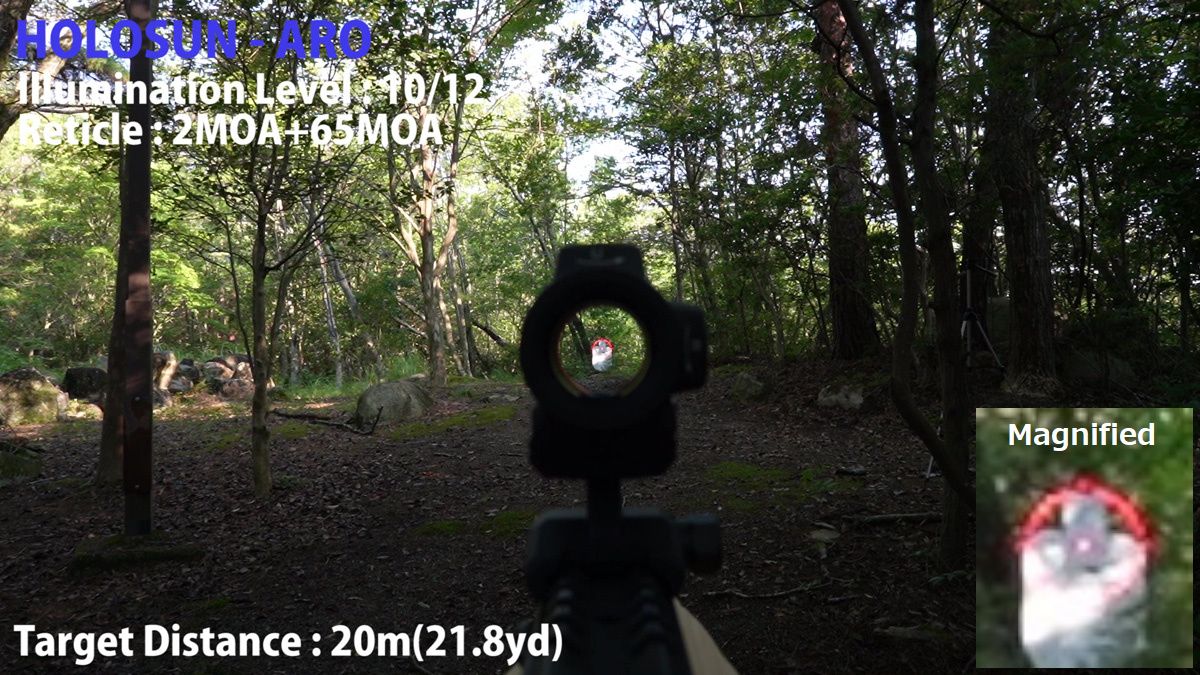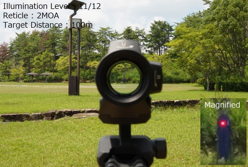 ●写真は撮影環境に適した常識的な明るさでマルチレティクルを灯している状態。2MOAモードにすると少し目立ちにくくなるが、見えやすいことに変わりはない。ここ最近のエントリーモデルの中ではSIG SAUER – ROMEO5 Gen2が一番見えにくく、次点でMD-21、そしてAROと続く順位だ。