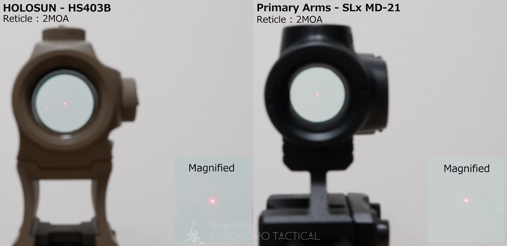 他社代表としてPrimary Arms – SLx MD-21を選出させた理由は、今年登場した新生エントリーモデルのダットサイトであると同時に、こちらも非常に透明度の高いレンズという似たような性質を持つということで登場してもらった。