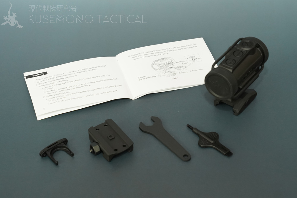 ●電池は変わらずCR2032を使用。電池寿命は2MOAドットのみで5万時間、サークルレティクルで2万時間とある。どの輝度設定でそれだけ保つのかは不明。