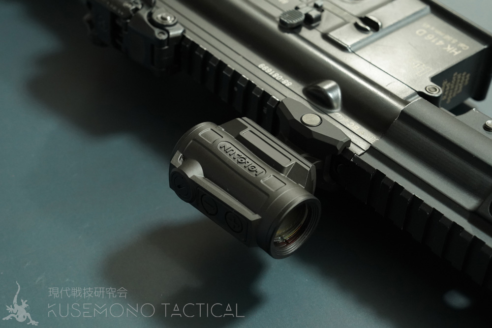 ●また、レンズの光透過性も向上しているためHS403Bよりも暗視装置と一緒に使いやすい。より上の機種には負けるが、価格が倍以上のAimpoint – Duty RDSと同等レベルだ。これはMD21の時にも感じたことだが、エントリー向けレベルのダットサイトもとうとうここまで暗視装置対応能力が上がったのかと感心する。これからはこれがスタンダードとなるだろう。