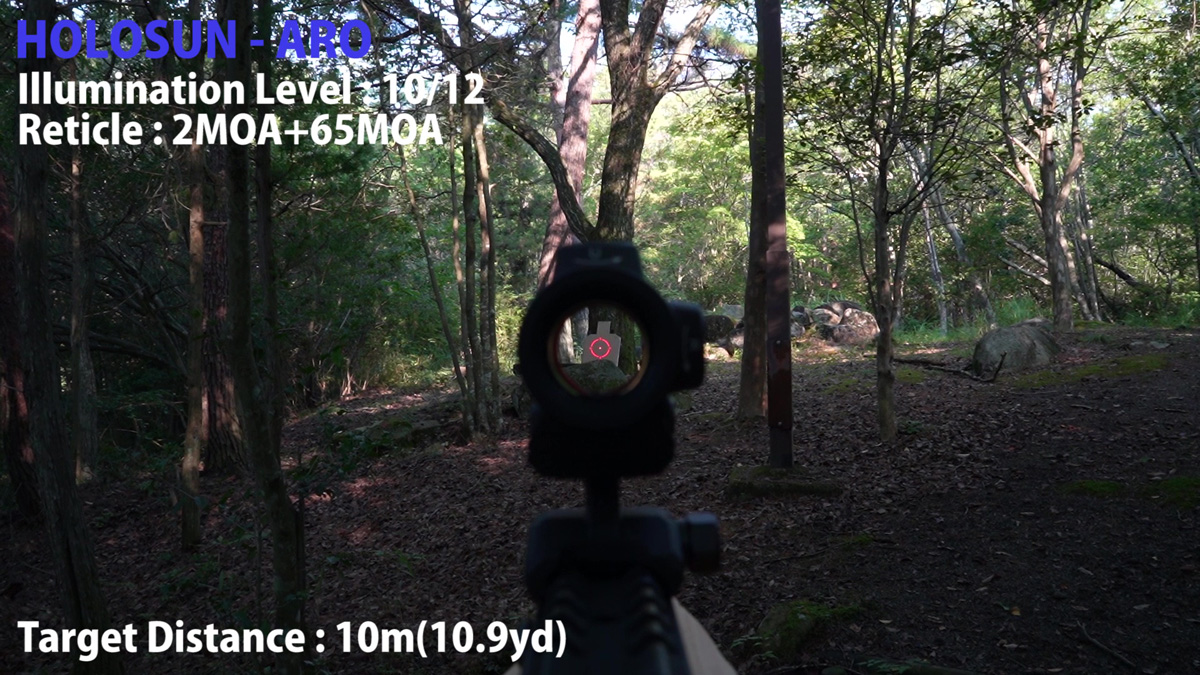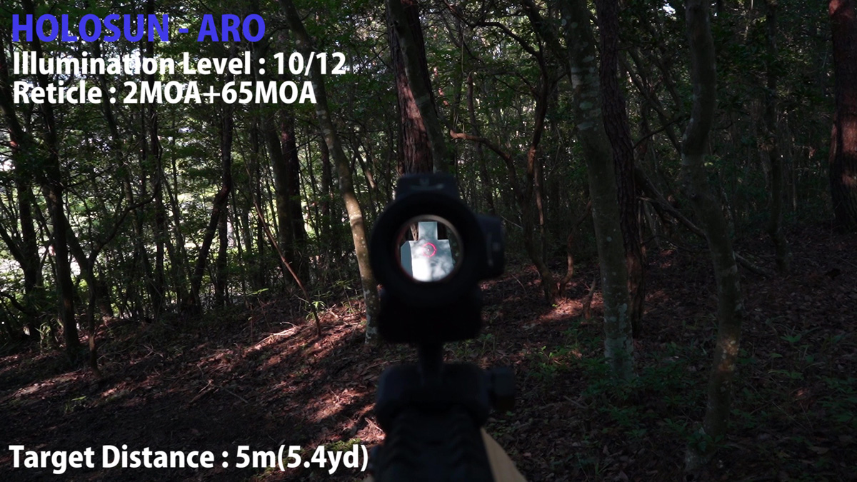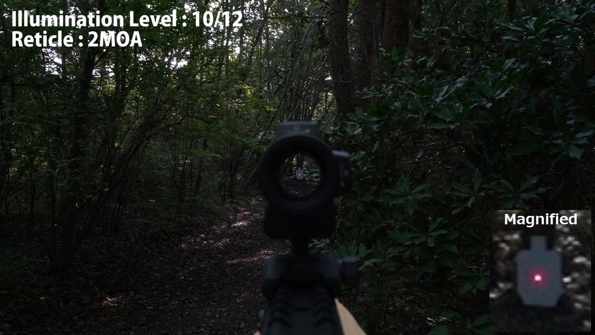 ●65MOAのサークルレティクルは50メートル以内でのCQB射撃で効力を発揮しやすい。前世代と比べて光学性能も向上しているため明暗の激しい林内でもより使いやすく感じる。