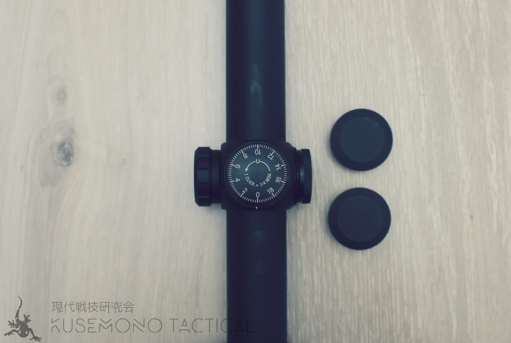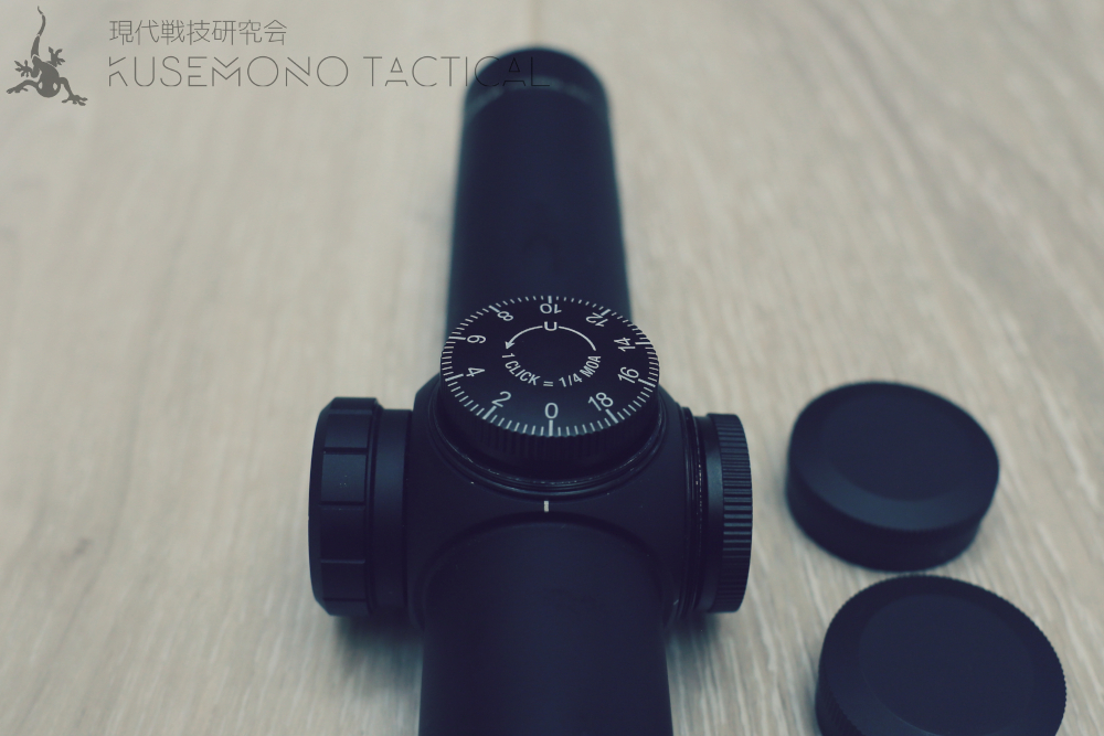 ●1クリックの移動量は1/4MOA(100mにおける約7mm)で、最大移動量はなんと180MOAと非常に多い。