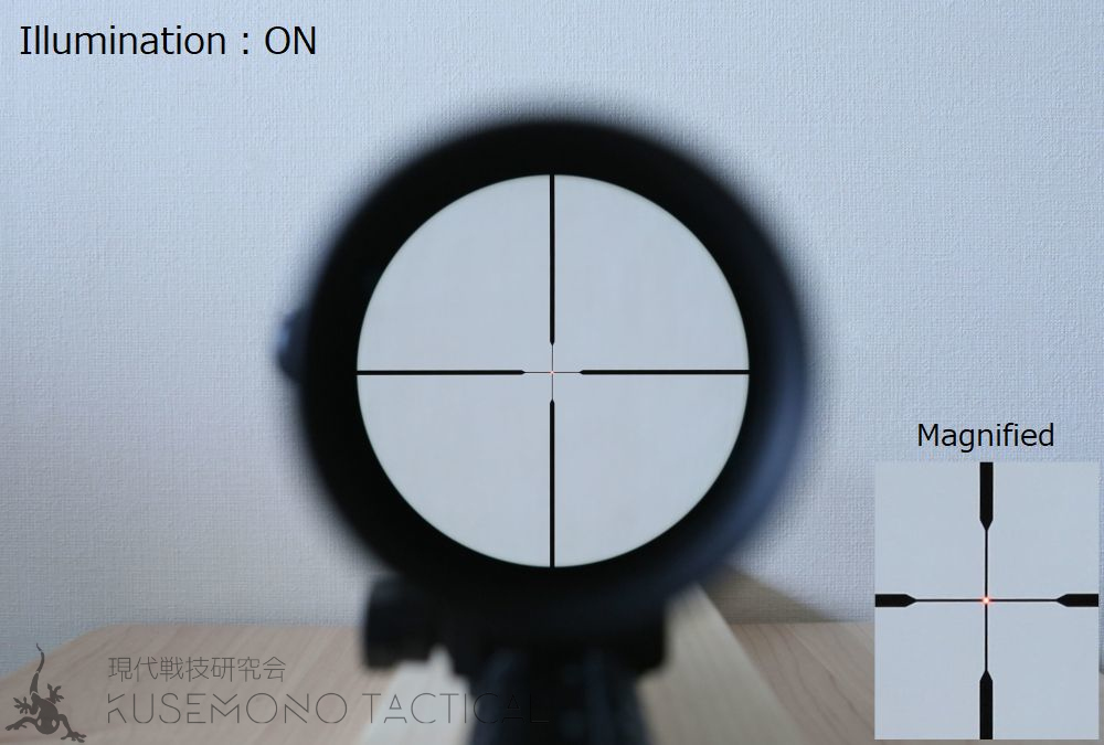 ●DuplexレティクルのイルミネーションはVX-RやVortex Razor HD Gen2Eのように日中でも明るいファイバーオプティクスを使用。この方式は明るいが単純に点としての光らせ方しかできないため、イルミネーションは中心点のみ光る。
