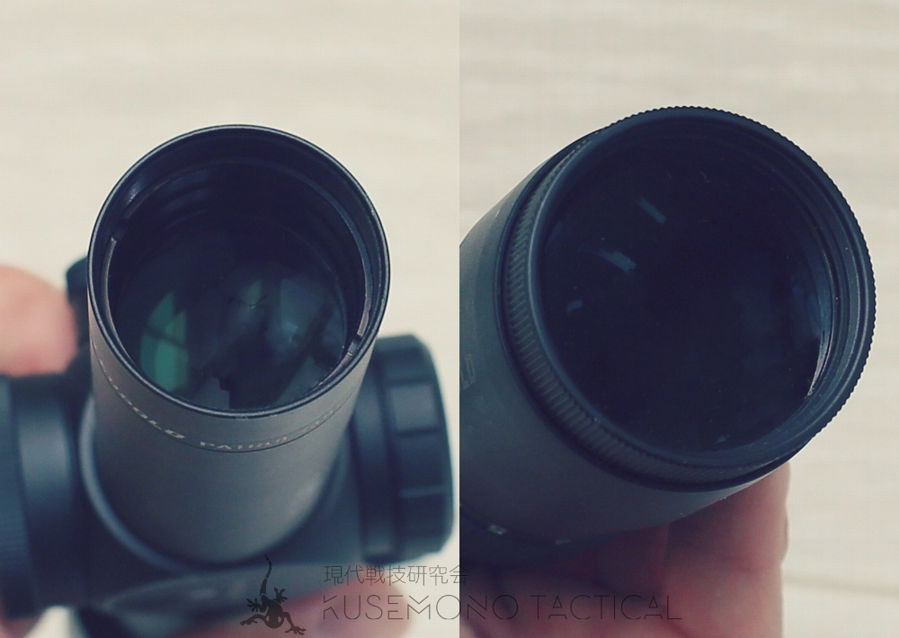 ●薄緑と薄青色のマルチコーティングが施されているレンズ。対物レンズ径は24mmと一般的なLPVOのレンズサイズである。