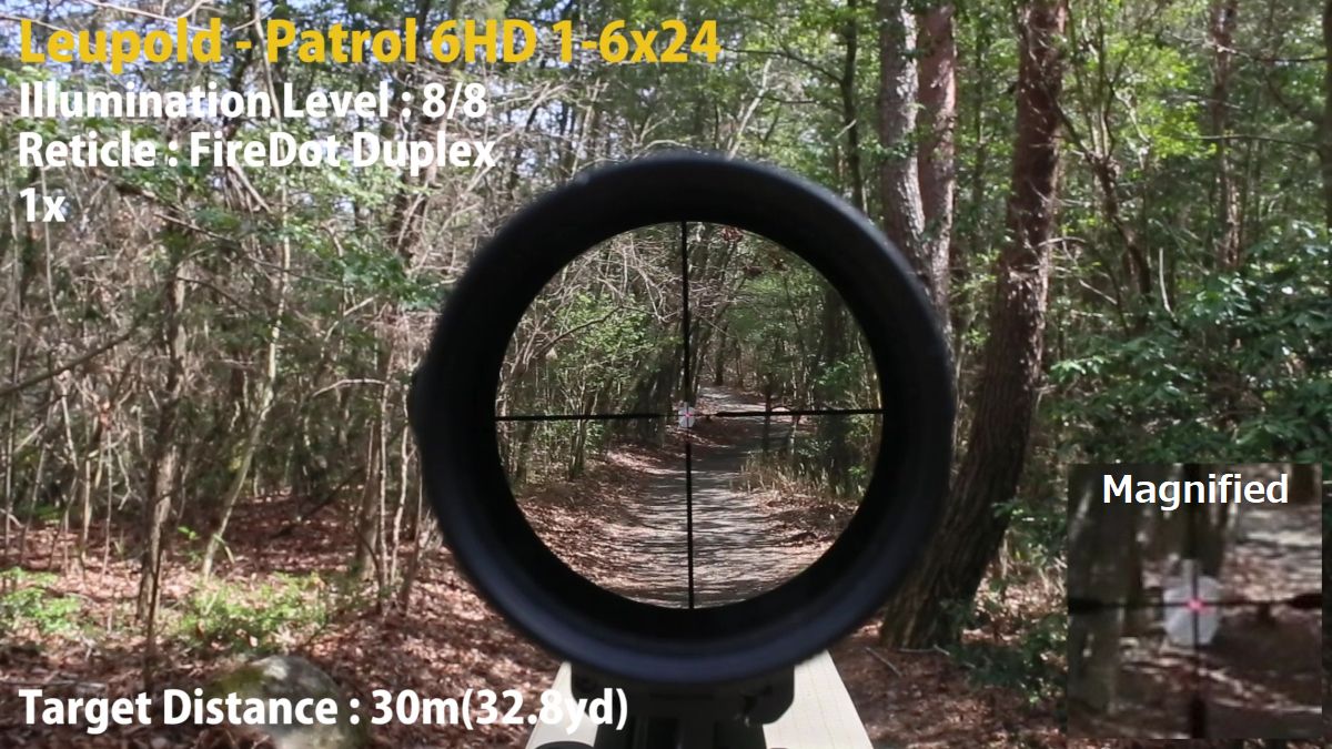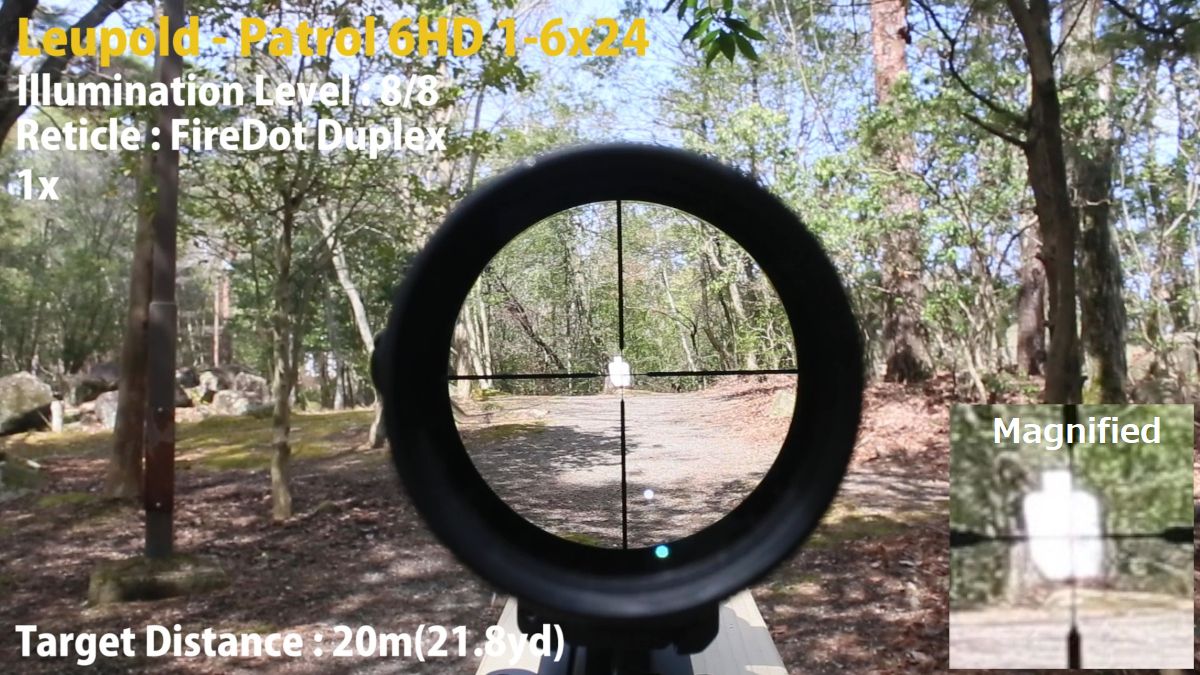 ●このPatrol 6HDの持ち主は猟銃(レミントン – M870)に載せる目的で購入した。元々はブッシュネル社の3-9倍スコープ(製品名不明)を使っていたが、50m以下の射撃しか行わず、素早い照準もできないと言うことでダットサイト(Aimpoint T1)に変更。だがそれだと少し距離が出た際の詳細がわからないということで素早い照準と遠くも見れるLPVOという判断でPatrol 6HDを購入したとのこと。
